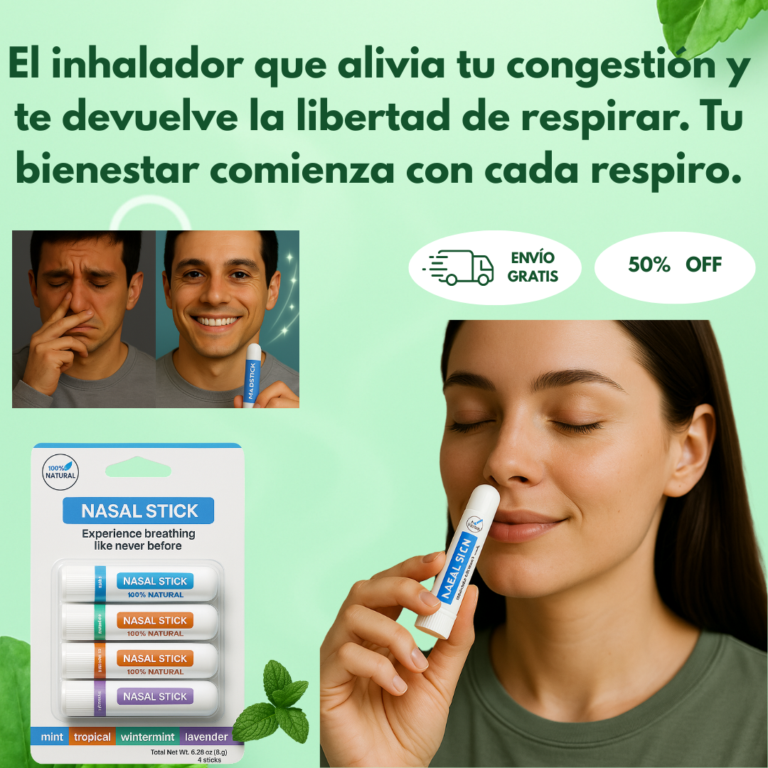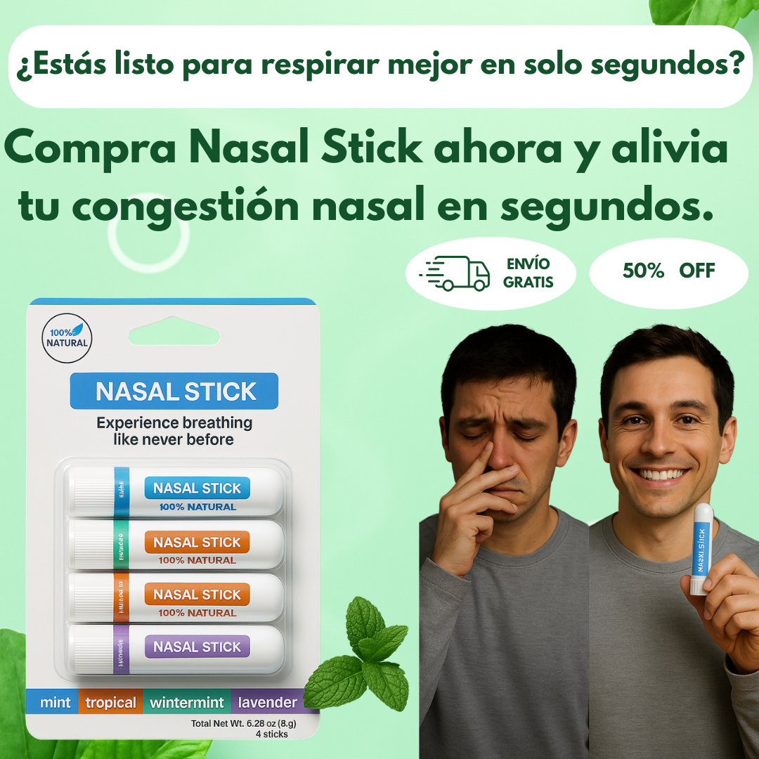 Siente la diferencia al instante con Nasal Stick. Su fórmula 100% natural alivia la congestión nasal y reduce la inflamación rápidamente. Despeja tus vías respiratorias de forma eficaz y disfruta de una respiración fluida cada día.